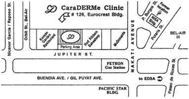 Contact UsCaraDERMe CLINIC For more information or to schedule an appointment, call us at (632) 899-9677 / (632) 897-7685 / (632) 895-1877 / (0905) 222-2644 (Mobile) FAX: (632) 895-1877 email: dr_rose_caraderme@yahoo.com *OUR NEW CLINIC HOURS EFFECTIVE JANUARY 2006: Monday - Saturday |