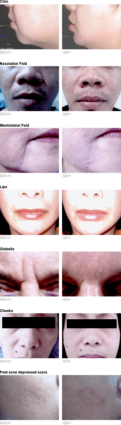 JUVEDERM / RESTYLANE / HYLAFORM / hyaluronic acid (temporary filler lasts for 6 mos.-1 yr.)